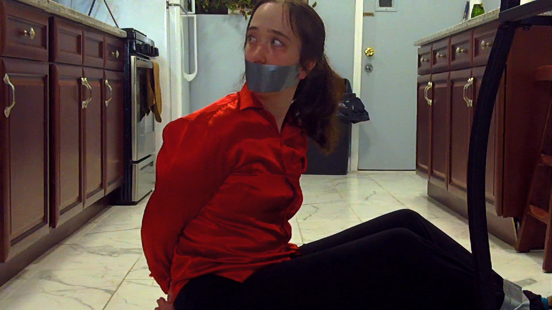| Here is a great scene from this Peruvian comedy series. Towards the end of this episode, there are group of five people (three women and two putzes) all of whom are bound with their hands behind their backs and their mouths taped shut (with silver tape) following a robbery. |